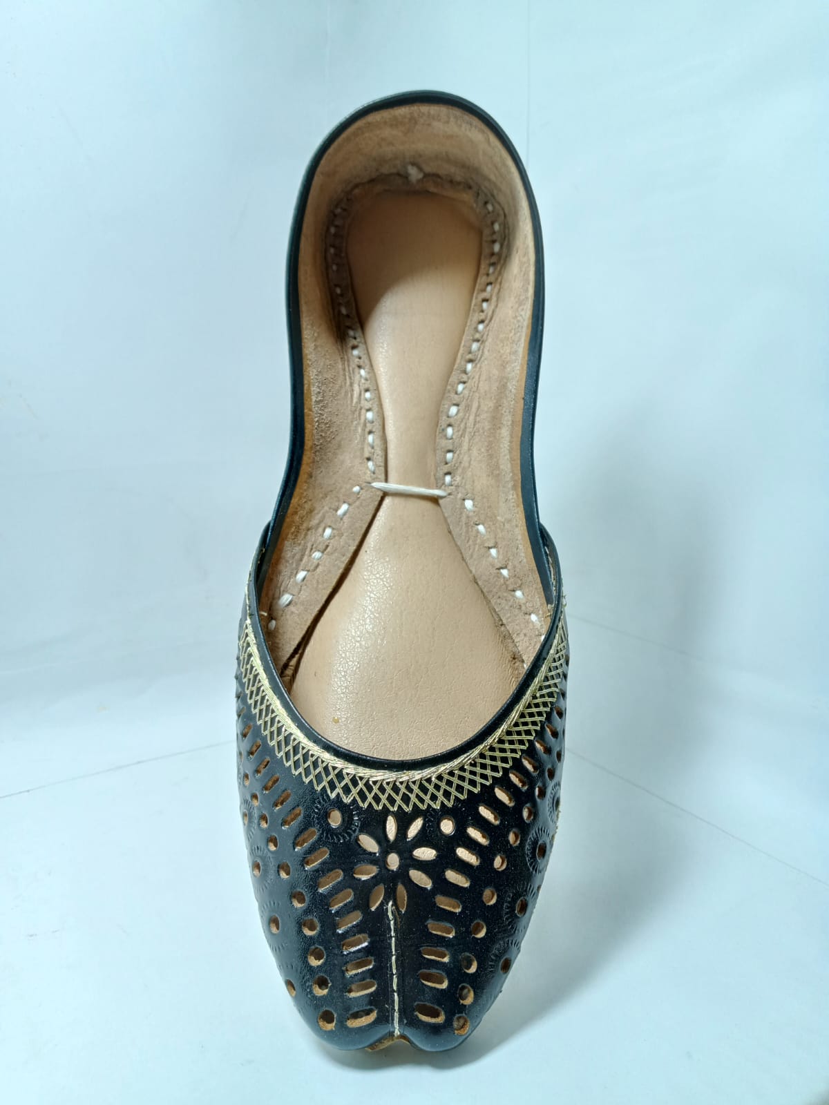 Step into the night with unparalleled sophistication. The Jeniius 'Laila' Khussa is the classic black flat, reimagined with an artist's touch and a bold spirit. Crafted from deep, rich black genuine leather, this shoe is a versatile and essential addition to any discerning wardrobe.